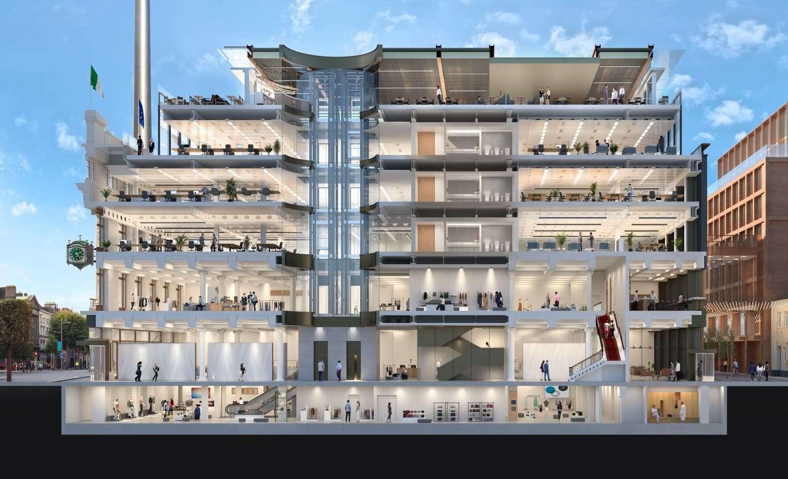 In November it was also announced that the Earl Building, representing approximately a third of the office space, had been sold to the Health Service Executive (HSE), on behalf of the Rotunda Hospital, for a new maternity outpatient hospital catering for over 100,000 outpatients annually.The restoration of the iconic Clerys building reached practical completion in June 2023 and retains its historic features including the colonnaded façade, internal staircases, columns, ceilings and the famous refurbished Clerys clock. The scheme combines traditional elements and modern concepts to create a landmark destination which will be a vibrant, thriving space on Dublin’s O’ Connell Street. The scheme has achieved LEED Gold certification and WiredScore Platinum certification.