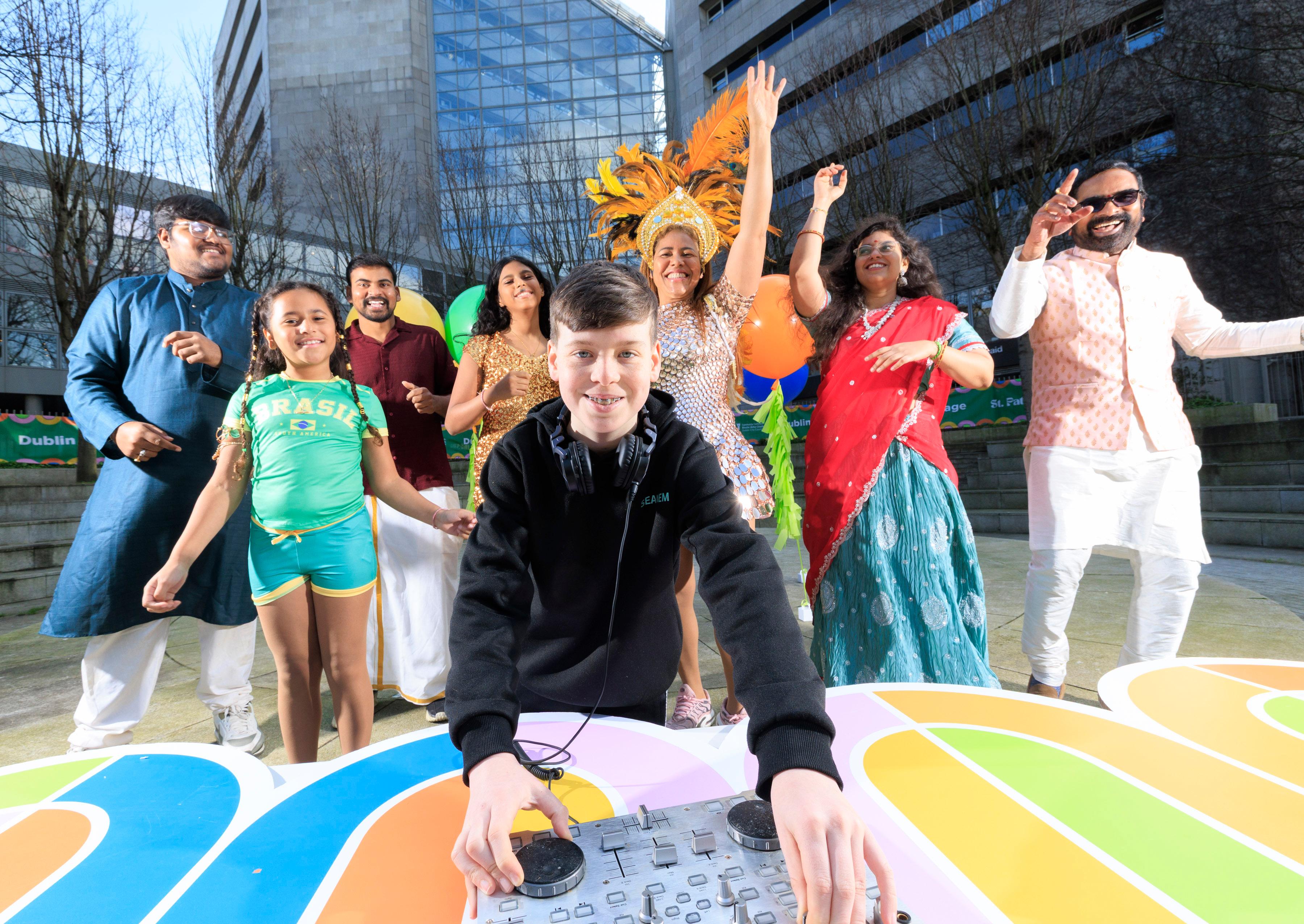 Repro Free: 04/03/2026 Sadbh Grehan, Chair Balance & Acrobatics is pictured with Members of Samba Dance Brazil and Members of CICI – Indian Diaspora Group at the launch of the Dublin City Council 2026 St. Patrick’s Festival Family Village at Wood Quay Amphitheatre. Running from 14 – 16 March 2026, the village is specially designed as a central destination for families with younger children during the Festival; featuring hands-on workshops such as the Children’s Willow Fish Workshop, playful entertainment from the Bee-ology circus show and DJ SEANEM, and interactive walkabout performances including Juggler Brendan, and Juggle Boards. Picture Andres Poveda
