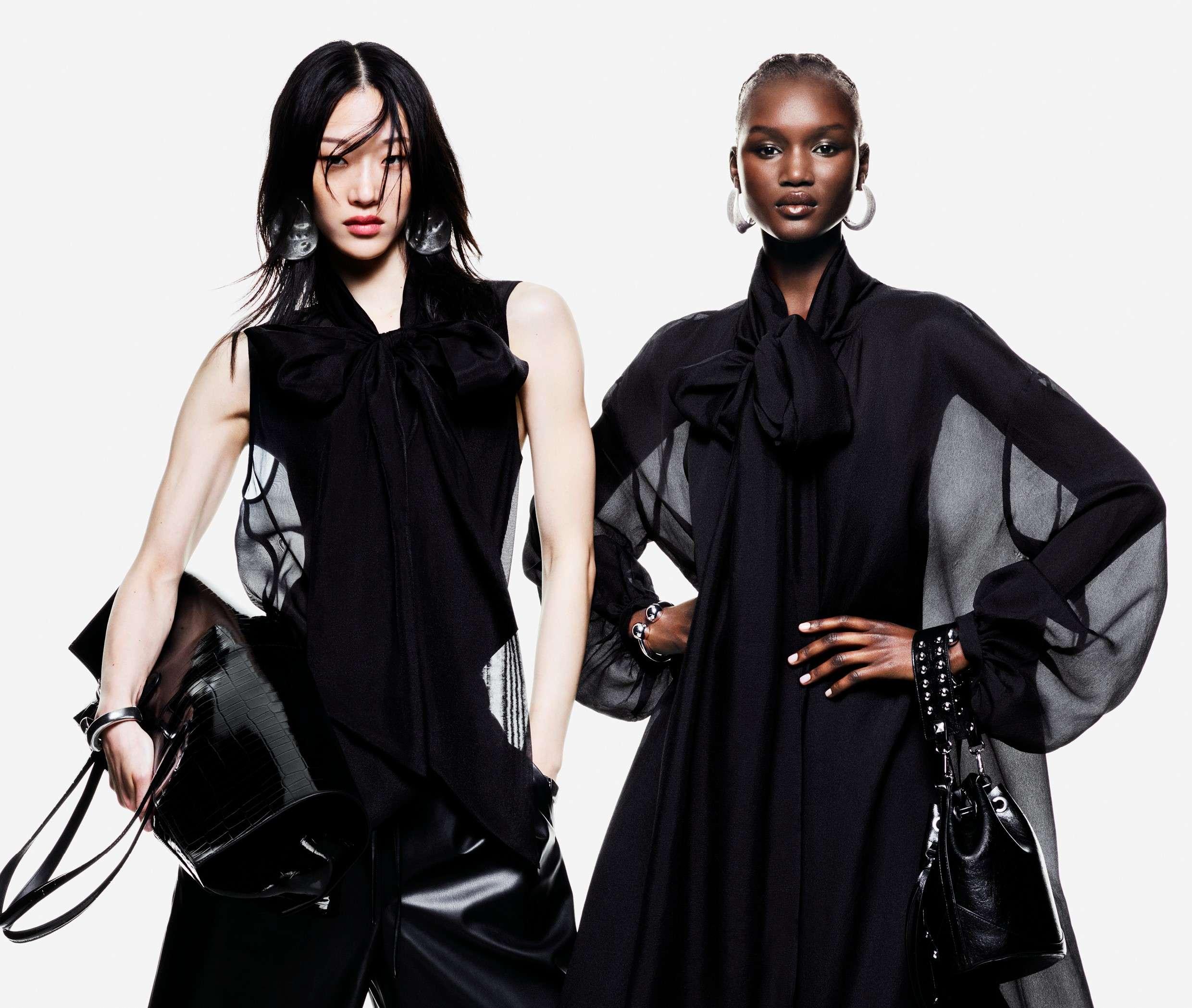 For H&M Fall 2023, Baroque meets neo-noir with romantic, opulent silhouettes mixing with faux leather looks and denim, inspired by the late 1990s. Power shoulders, narrow waists and elongated lines feature among the strong suiting, long dresses, and statement tops. Sheer fabrics, lace, lingerie details and pearl embellishments elevate each piece spectacularly, while a neutral colour palette of black, silver, earth tones and off-whites keep the tone sophisticated. The collection launches on 14th September 2023 and will be available in selected stores worldwide and online at hm.com.